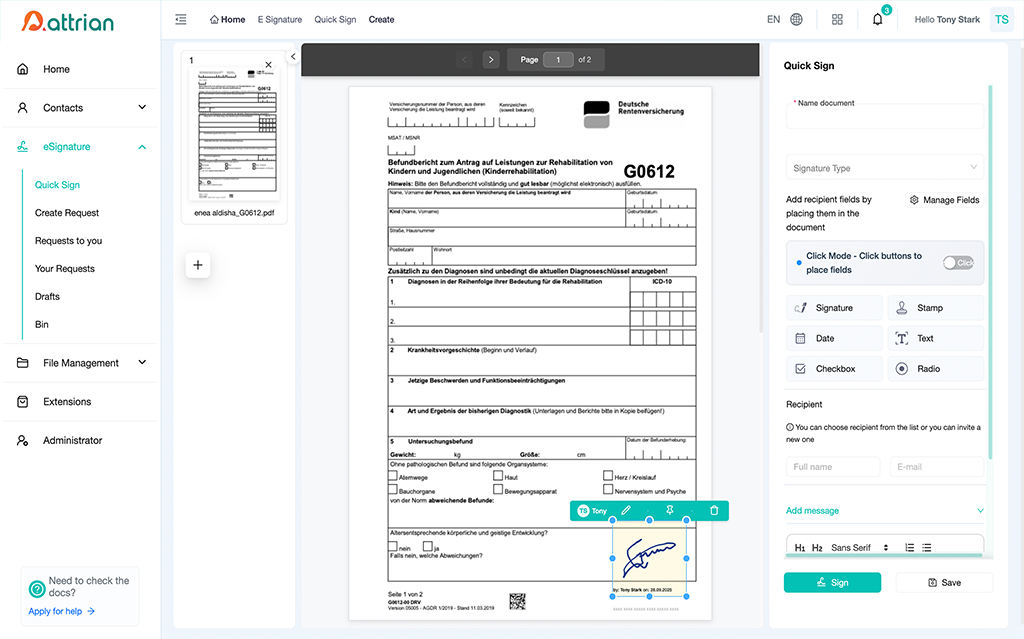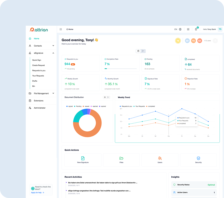 Mit unserer benutzerfreundlichen Web-App können Unternehmen Signatur- und Identifikationsprozesse vollständig digital und ohne Installation im Browser abwickeln. Dokumente können hochgeladen, Empfänger verwaltet und Signaturen rechtskonform eingeholt werden. Dank flexibler Signaturarten, Echtzeit-Statusverfolgung und sicherer Speicherung bietet Attrian eine intuitive Lösung für effiziente Workflows.